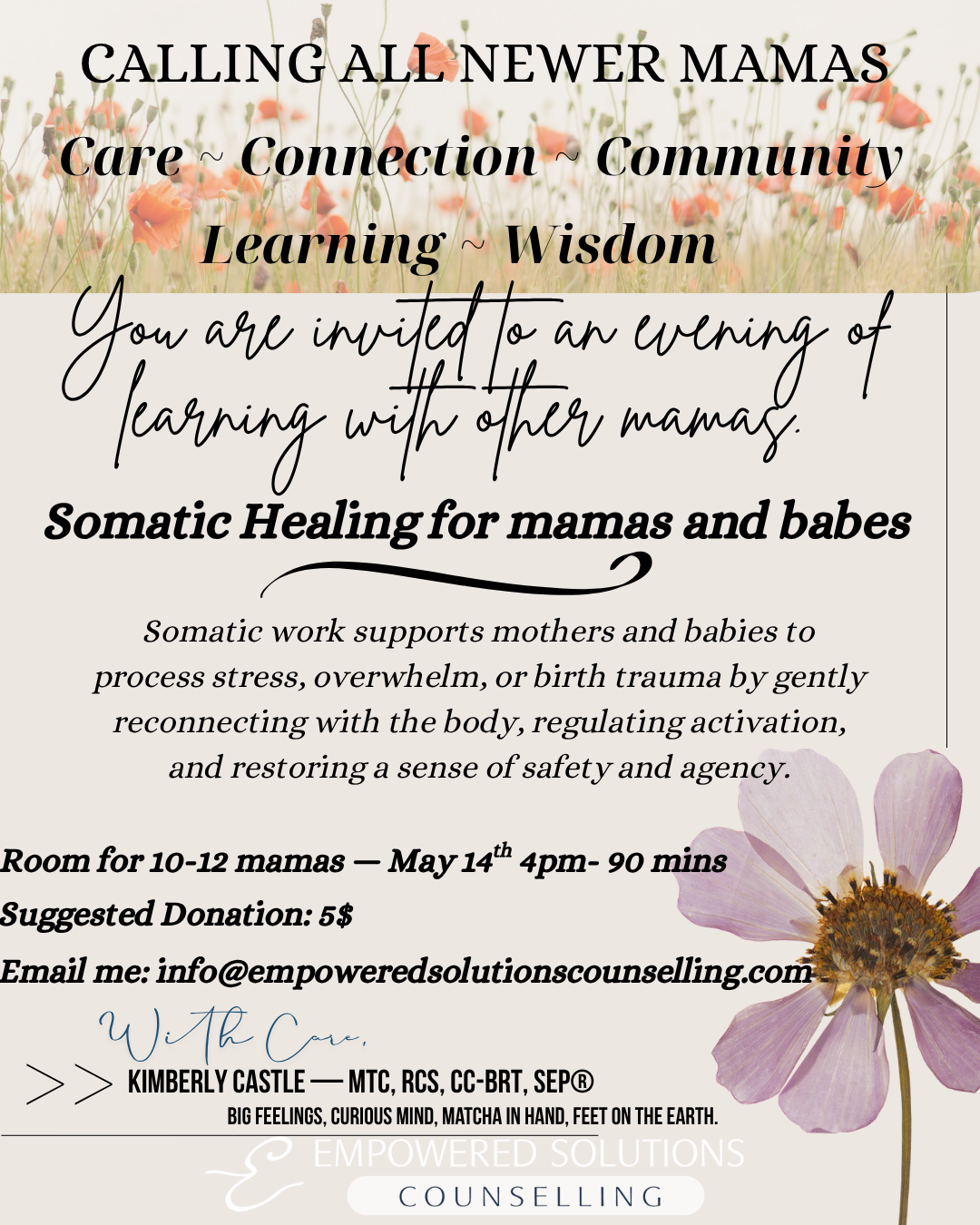 Somatic work supports mothers and babies to process stress, overwhelm, or birth trauma by gently reconnecting with the body, regulating activation, and restoring a sense of safety and agency.